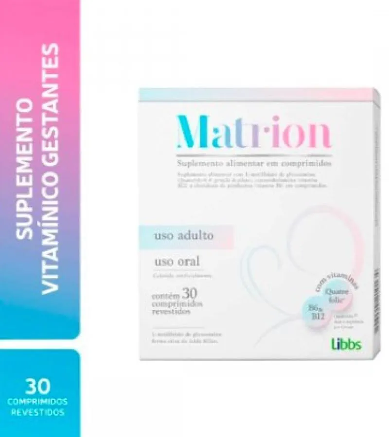 O Matrion é um suplemento alimentar em comprimidos, indicado principalmente para mulheres em período gestacional. Sua fórmula tem como principal ingrediente o Quatrefolic, um folato de quarta geração, isto é, uma versão inovadora e mais atual, que representa a forma biologicamente ativa do Ácido Fólico. Ainda, conta com Vitamina B12 e Vitamina B6 (não produzidas pelo corpo humano), que auxiliam na formação de células vermelhas do sangue, no funcionamento do sistema imune, no metabolismo de proteínas, carboidratos e gorduras e também da homocisteína, cuja a elevação dos níveis está associada ao aumento do risco de complicações durante a gravidez.