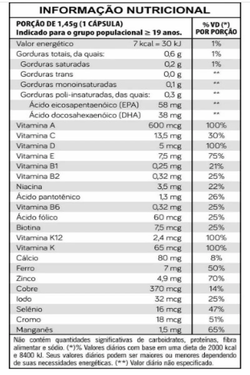 É um suplemento a Base de ômega-3 com vitaminas e minerais. O ômega-3 pode auxiliar na manutenção dos níveis saudáveis de colesterol e triglicérides, ajudando na prevenção de doenças cardiovasculares, quando associado a hábitos alimentares saudáveis.