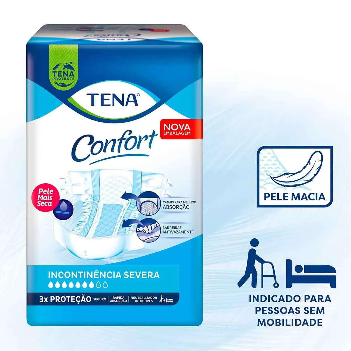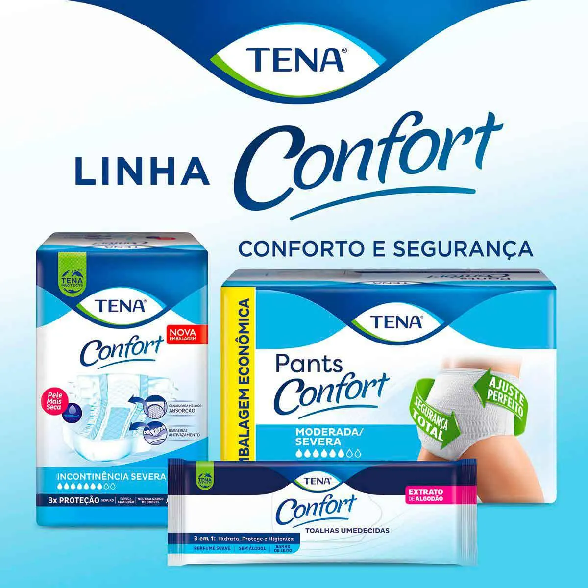 E mais: Tena Confort possui barreiras altas antivazamentos e Extrato de Aloe Vera em sua composição, que ajuda a suavizar a região íntima, tudo isso para tornar a experiência da pessoa cuidada mais agradável e confortável.