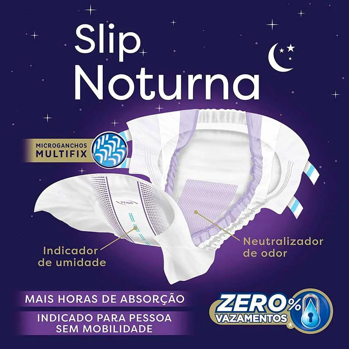 Indicada para incontinência urinária severa, a fralda Tena Slip Noturna oferece máxima proteção e 0% de vazamento durante toda a noite, proporcionando suavidade e menos ruído, além de contar com uma cobertura externa similar ao tecido, garantindo melhor circulação de ar e sensação de frescor.