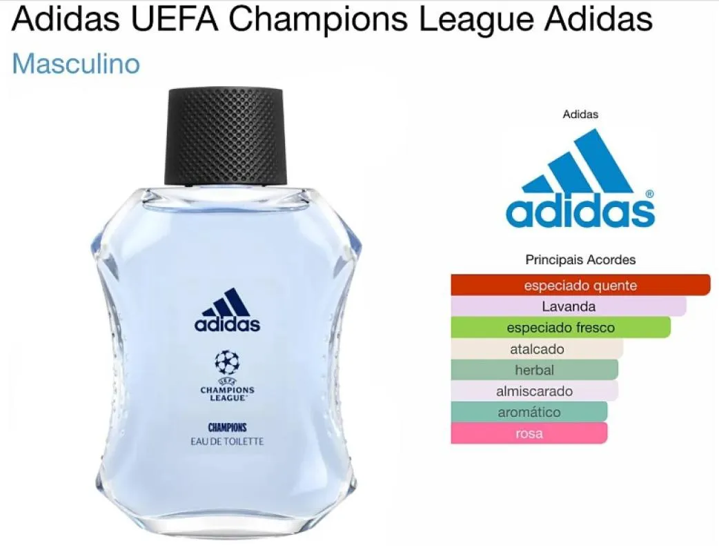 O Perfume UEFA Champions League, de Adidas é composto por óleos essenciais naturais de Gengibre e Hortelã e conta com a tecnologia ""All Day Fresh"", para frescor ao longo do dia. Ele conta com uma fórmula vegana de longa duração.