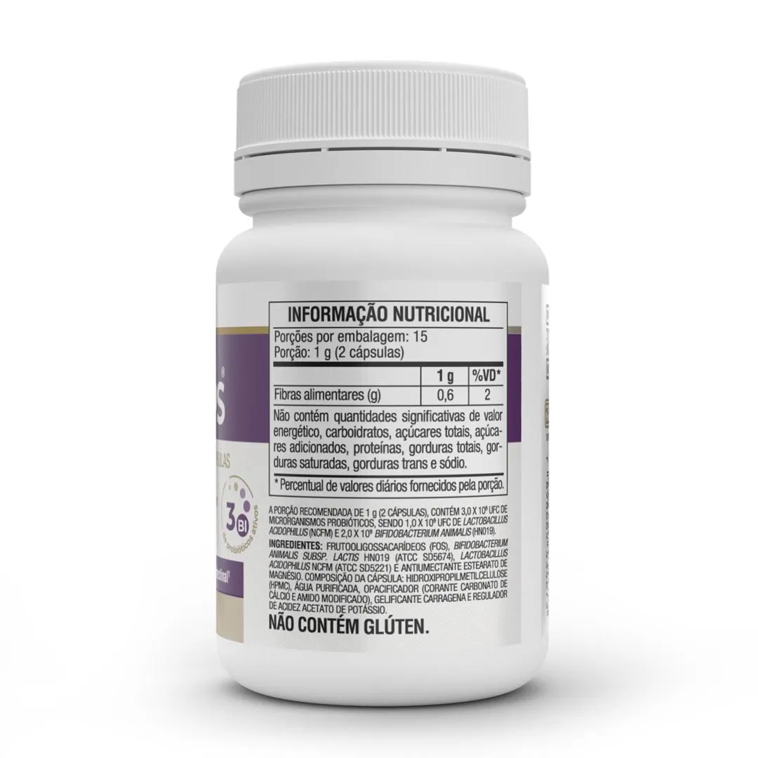 Lactobacillus acidophilus (NCFM), Bifidobacterium animalis (HN019), agente de massa celulose microcristalina, antiumectante dióxido de silício e lubrificante estearato de magnésio.
