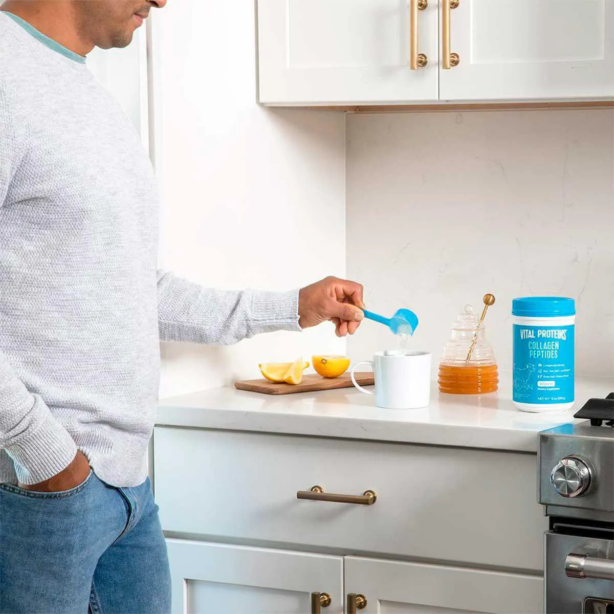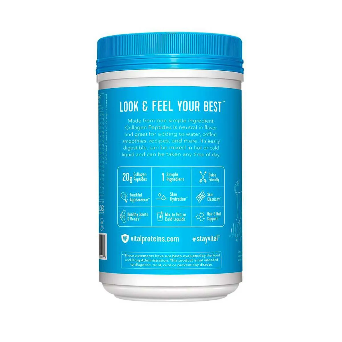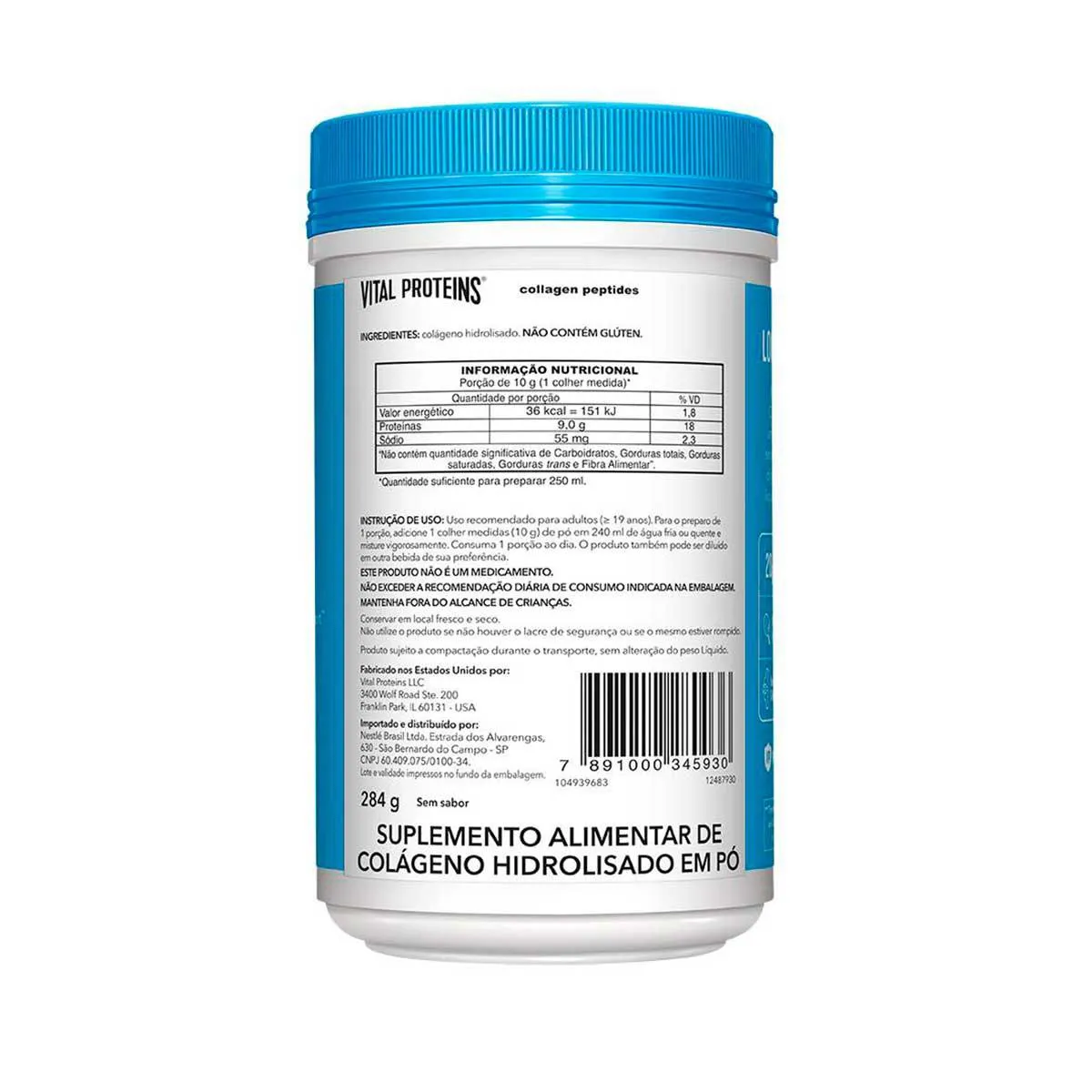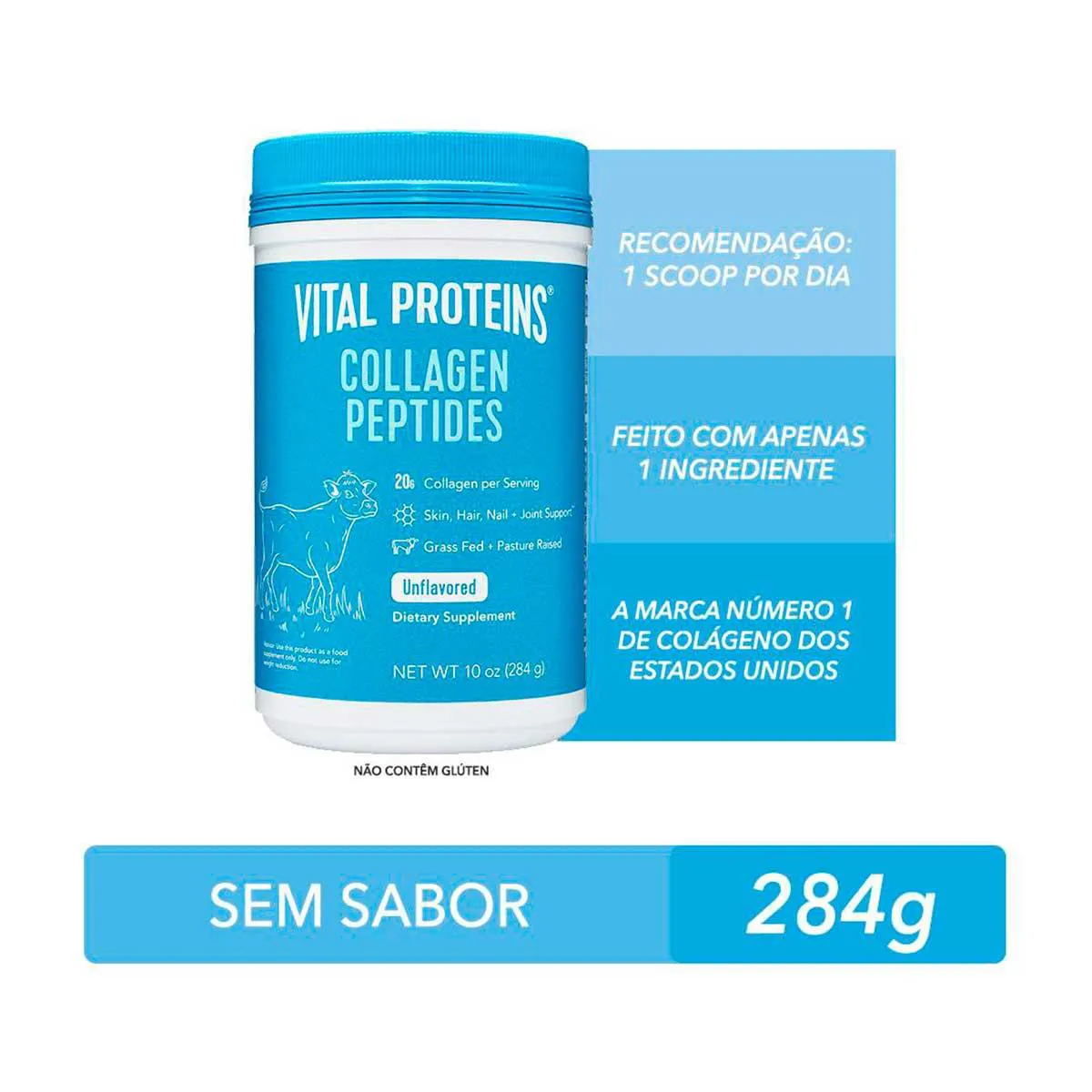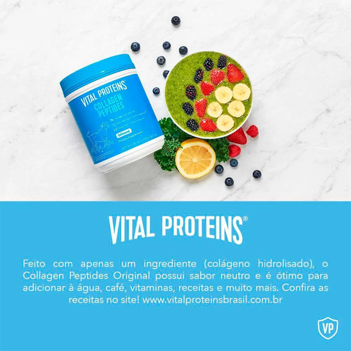 Vital Proteins Collagen Peptides Original é um suplemento alimentar de colágeno hidrolisado em pó, feito apenas com ingrediente (Colágeno hidrolisado) e com sabor neutro, ótimo para misturar no café, água, vitaminas, receitas e mais.