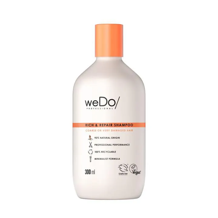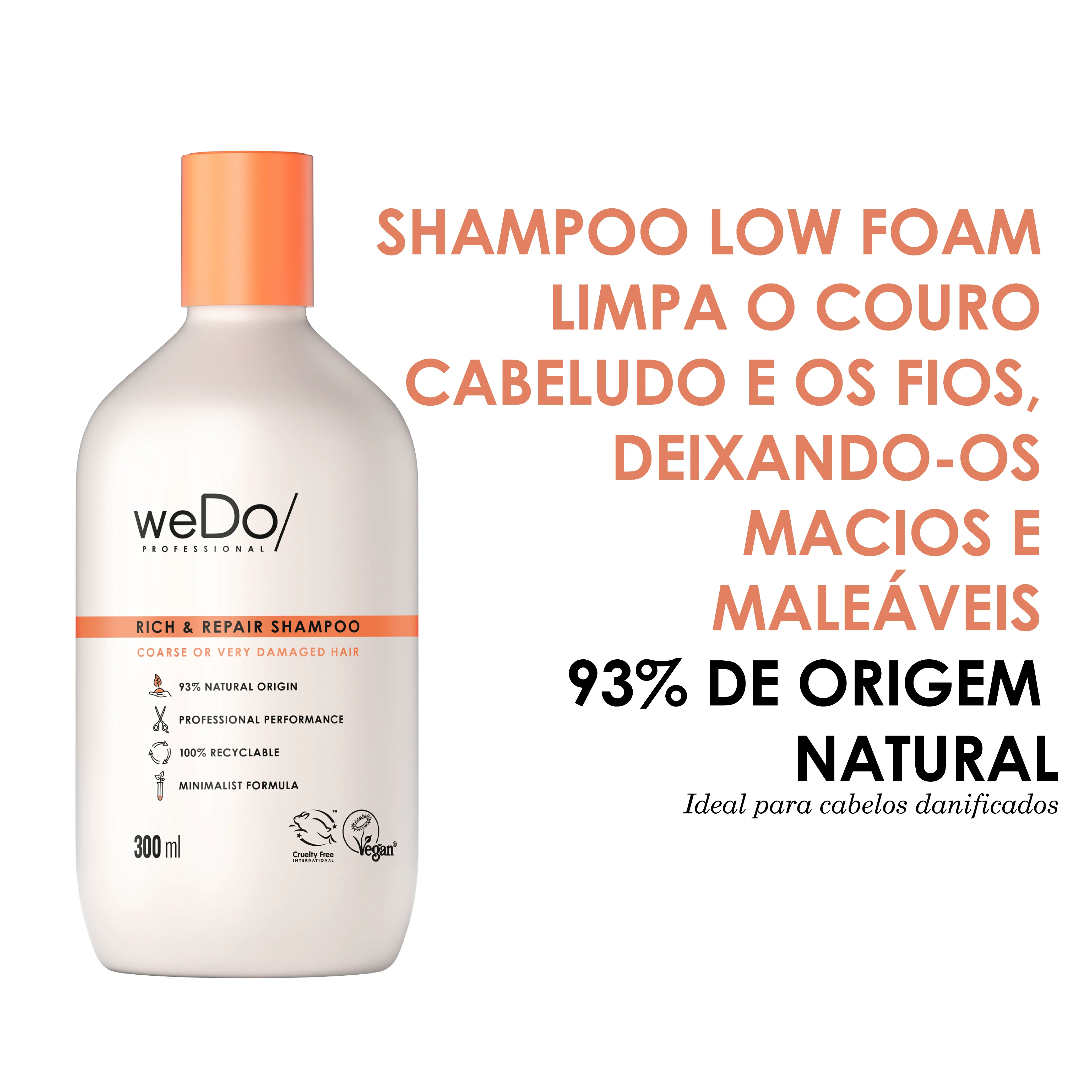 O Rich&Repair weDo/ é um shampoo low foam, ou seja, de pouca espuma, que limpa o couro cabeludo e o cabelo, enquanto reduz a quebra dos fios.